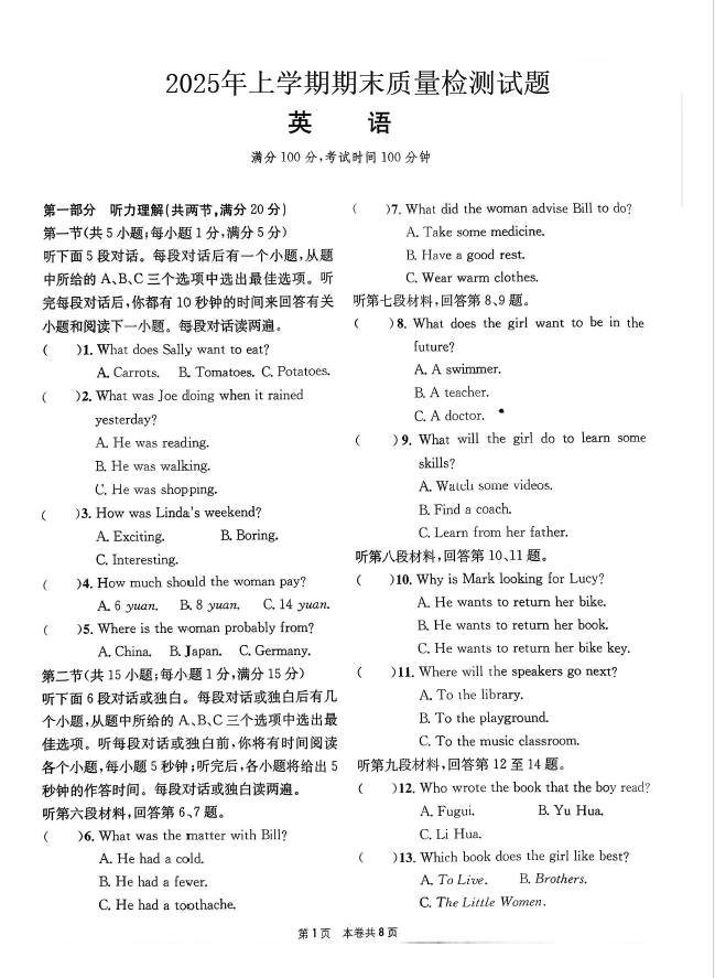 資料內(nèi)容:【25年 初一 初二 初三期末考試真題】