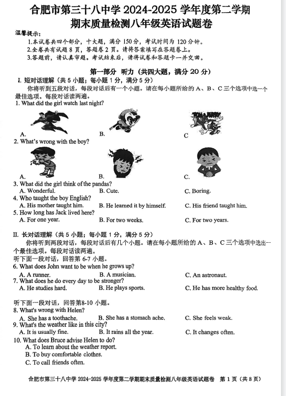 中考網(wǎng)整理了關(guān)于2024-2025學(xué)年安徽合肥三十八中學(xué)八年級下學(xué)期英語期末真題(圖片版),希望對同學(xué)們有所幫助,僅供參考。