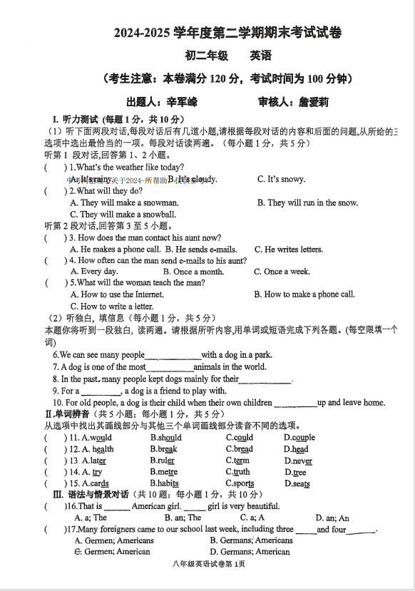中考網(wǎng)整理了關于2024-2025學年甘肅白銀十中八年級下學期英語期末真題(圖片版),希望對同學們有所幫助,僅供參考。