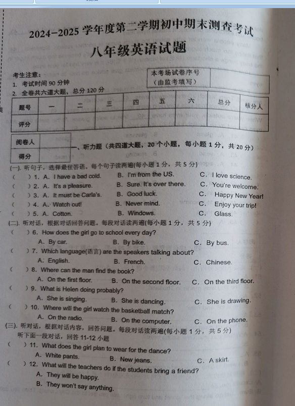 中考網(wǎng)整理了關(guān)于2024-2025學(xué)年黑龍江綏化海倫市八年級下學(xué)期英語期末真題(圖片版),希望對同學(xué)們有所幫助,僅供參考。
