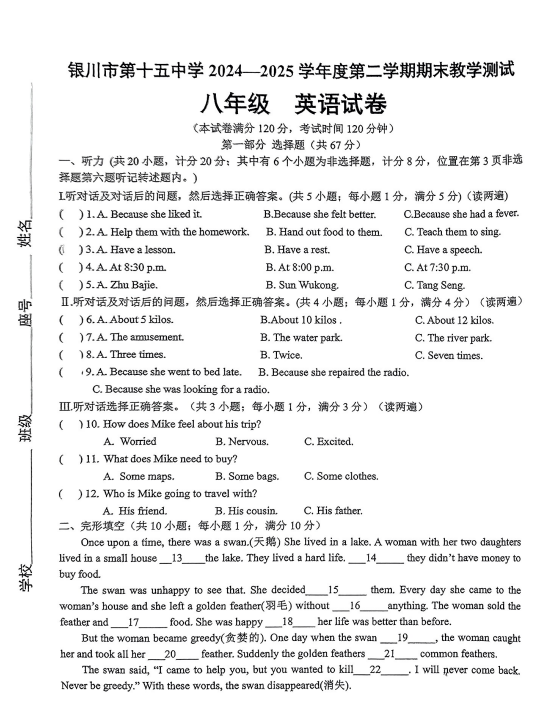 中考網(wǎng)整理了關(guān)于2024-2025學(xué)年寧夏銀川實(shí)十五中學(xué)八年級(jí)下學(xué)期英語期末真題(圖片版),希望對(duì)同學(xué)們有所幫助,僅供參考。