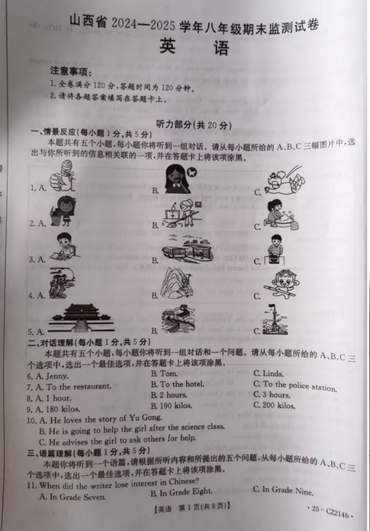 中考網(wǎng)整理了關(guān)于2024-2025學(xué)年山西呂梁臨縣八年級(jí)下學(xué)期英語期末真題(圖片版),希望對(duì)同學(xué)們有所幫助,僅供參考。