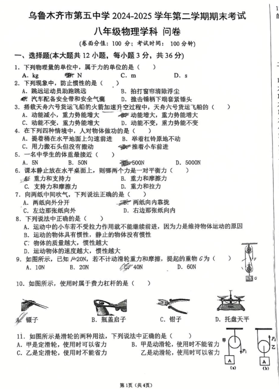 中考網(wǎng)整理了關(guān)于2024-2025學(xué)年新疆烏魯木齊五中八年級下冊物理期末真題(圖片版),希望對同學(xué)們有所幫助,僅供參考。