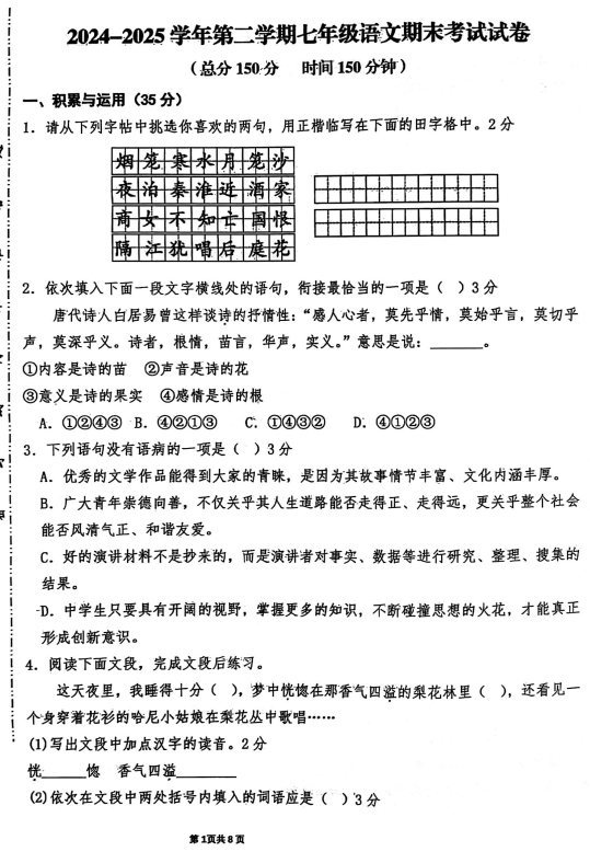 中考網(wǎng)整理了關(guān)于2024-2025學(xué)年甘肅武威涼州區(qū)南園學(xué)校七年級(jí)下冊(cè)語(yǔ)文期末真題(圖片版),希望對(duì)同學(xué)們有所幫助,僅供參考。