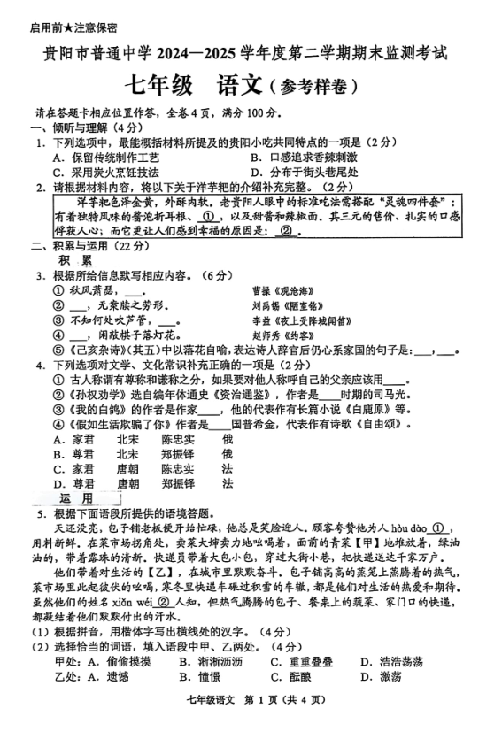 中考網(wǎng)整理了關(guān)于2024-2025學(xué)年貴州貴陽七年級下冊語文期末真題(圖片版),希望對同學(xué)們有所幫助,僅供參考。