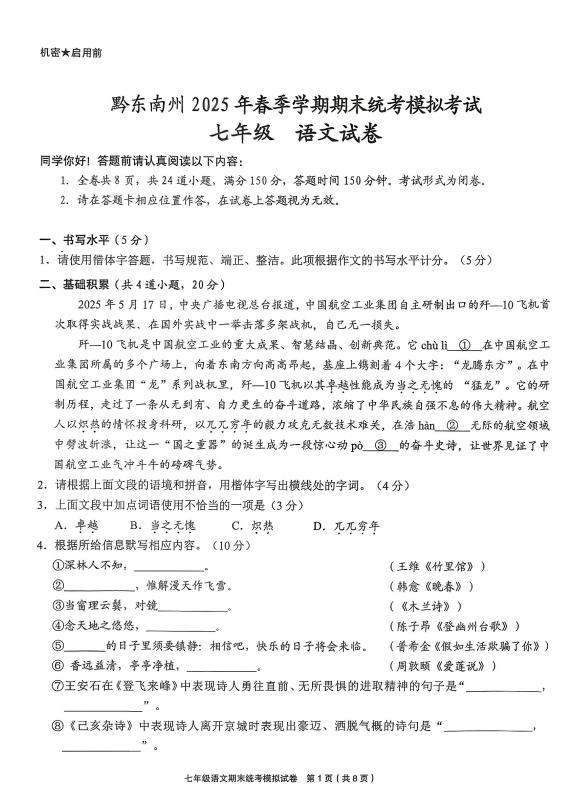 中考網(wǎng)整理了關于2024-2025學年貴州黔東南劍河縣四中七年級下冊語文期末真題(圖片版),希望對同學們有所幫助,僅供參考。