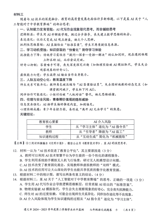 2024-2025學(xué)年貴州遵義七年級下冊語文期末真題(圖片版)(5)