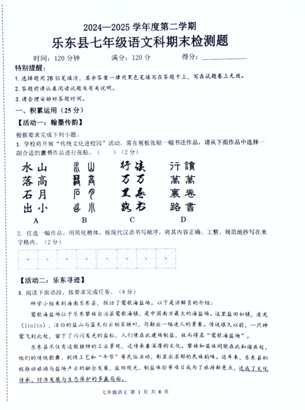 中考網(wǎng)整理了關(guān)于2024-2025學(xué)年海南樂(lè)東黃流中學(xué)七年級(jí)下冊(cè)語(yǔ)文期末真題(圖片版),希望對(duì)同學(xué)們有所幫助,僅供參考。