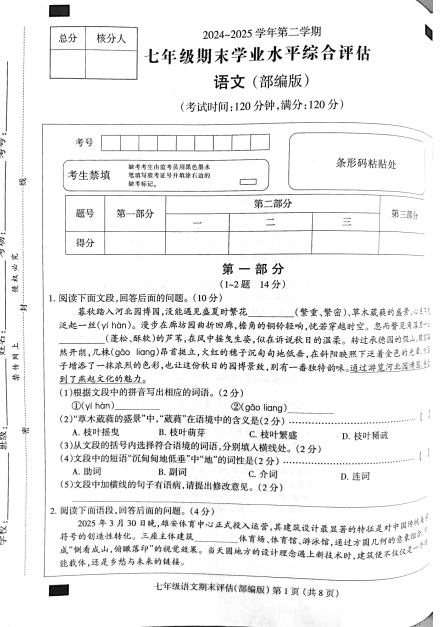 中考網(wǎng)整理了關(guān)于2024-2025學(xué)年河北張家口赤城縣七年級(jí)下冊(cè)語文期末真題(圖片版),希望對(duì)同學(xué)們有所幫助,僅供參考。