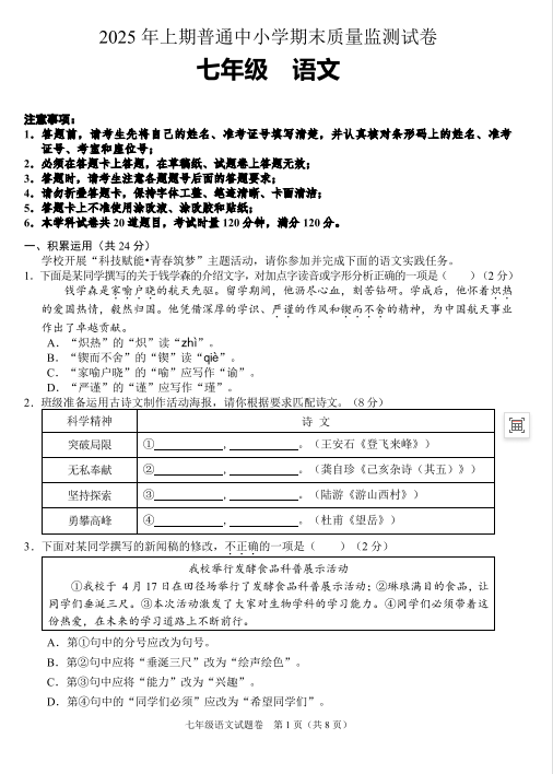 中考網(wǎng)整理了關(guān)于2024-2025學(xué)年湖南長沙望奎區(qū)七年級(jí)下冊(cè)語文期末真題(圖片版),希望對(duì)同學(xué)們有所幫助,僅供參考。