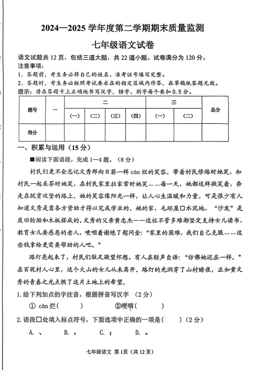中考網(wǎng)整理了關(guān)于2024-2025學(xué)年吉林吉林七年級(jí)下冊(cè)語(yǔ)文期末真題(圖片版),希望對(duì)同學(xué)們有所幫助,僅供參考。