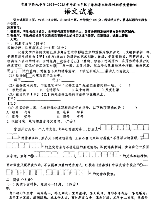 中考網(wǎng)整理了關(guān)于2024-2025學(xué)年吉林吉林九中七年級(jí)下冊語文期末真題(圖片版),希望對(duì)同學(xué)們有所幫助,僅供參考。