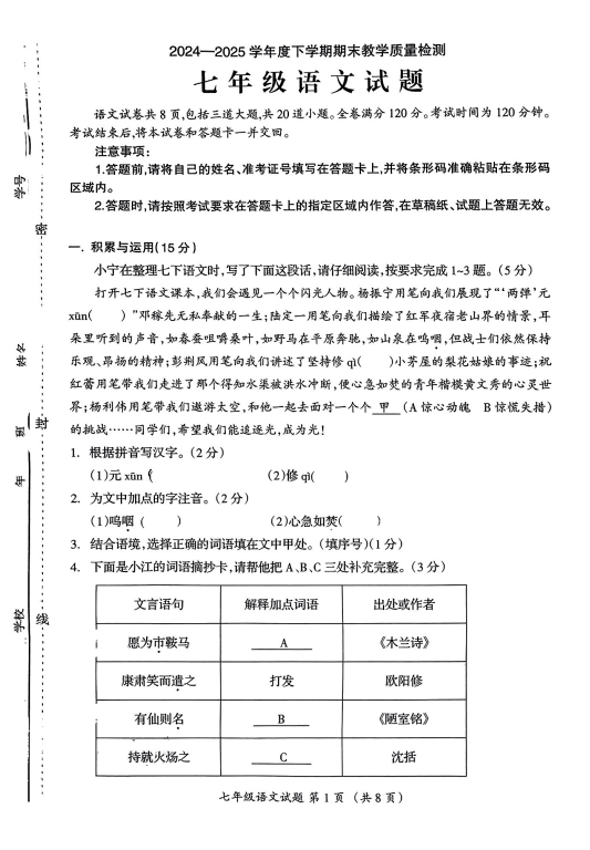 中考網(wǎng)整理了關(guān)于2024-2025學(xué)年吉林松原市七年級(jí)下冊(cè)語(yǔ)文期末真題(圖片版),希望對(duì)同學(xué)們有所幫助,僅供參考。