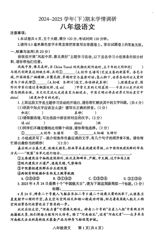 中考網(wǎng)整理了關(guān)于2024-2025學(xué)年河南焦作溫縣八年級下學(xué)期語文期末真題(圖片版),希望對同學(xué)們有所幫助,僅供參考。
