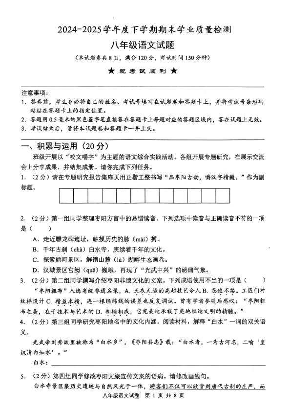 中考網(wǎng)整理了關(guān)于2024-2025學(xué)年湖北襄陽八年級下學(xué)期語文期末真題(圖片版),希望對同學(xué)們有所幫助,僅供參考。