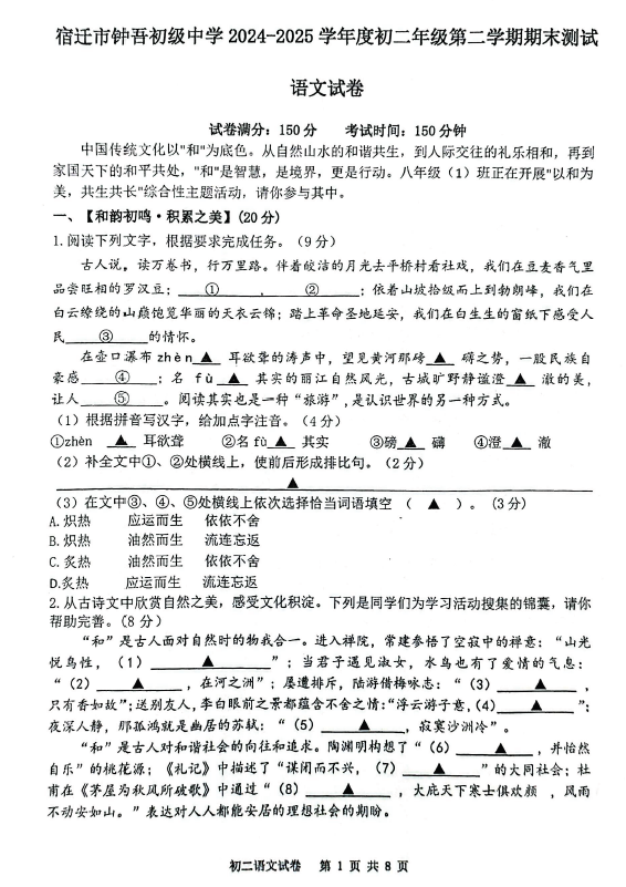 中考網(wǎng)整理了關(guān)于2024-2025學(xué)年江蘇宿遷鐘吾中學(xué)八年級(jí)下學(xué)期語(yǔ)文期末真題(圖片版),希望對(duì)同學(xué)們有所幫助,僅供參考。